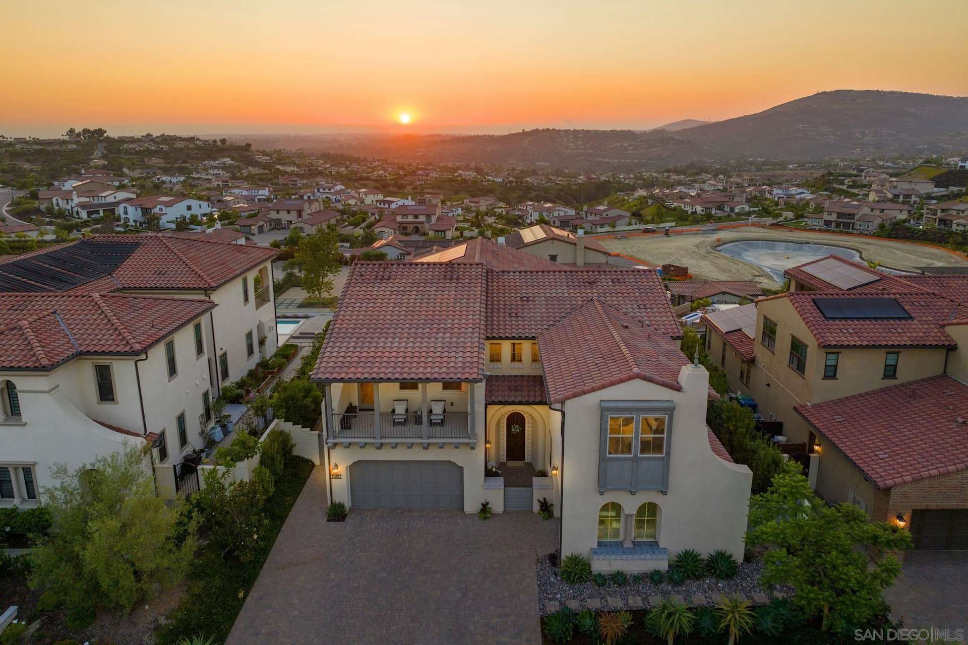 The outdoor oasis features a California room with a fireplace, an in ground 8-ft pool, and spa, elevated fire pit seating area, and turf area for play. Smart living with solar panels, home automation, and EV charging. Located in the top-rated Poway Unified School District, close to shopping, dining, beaches, and more, this home blends luxury and convenience for an unparalleled living experience.